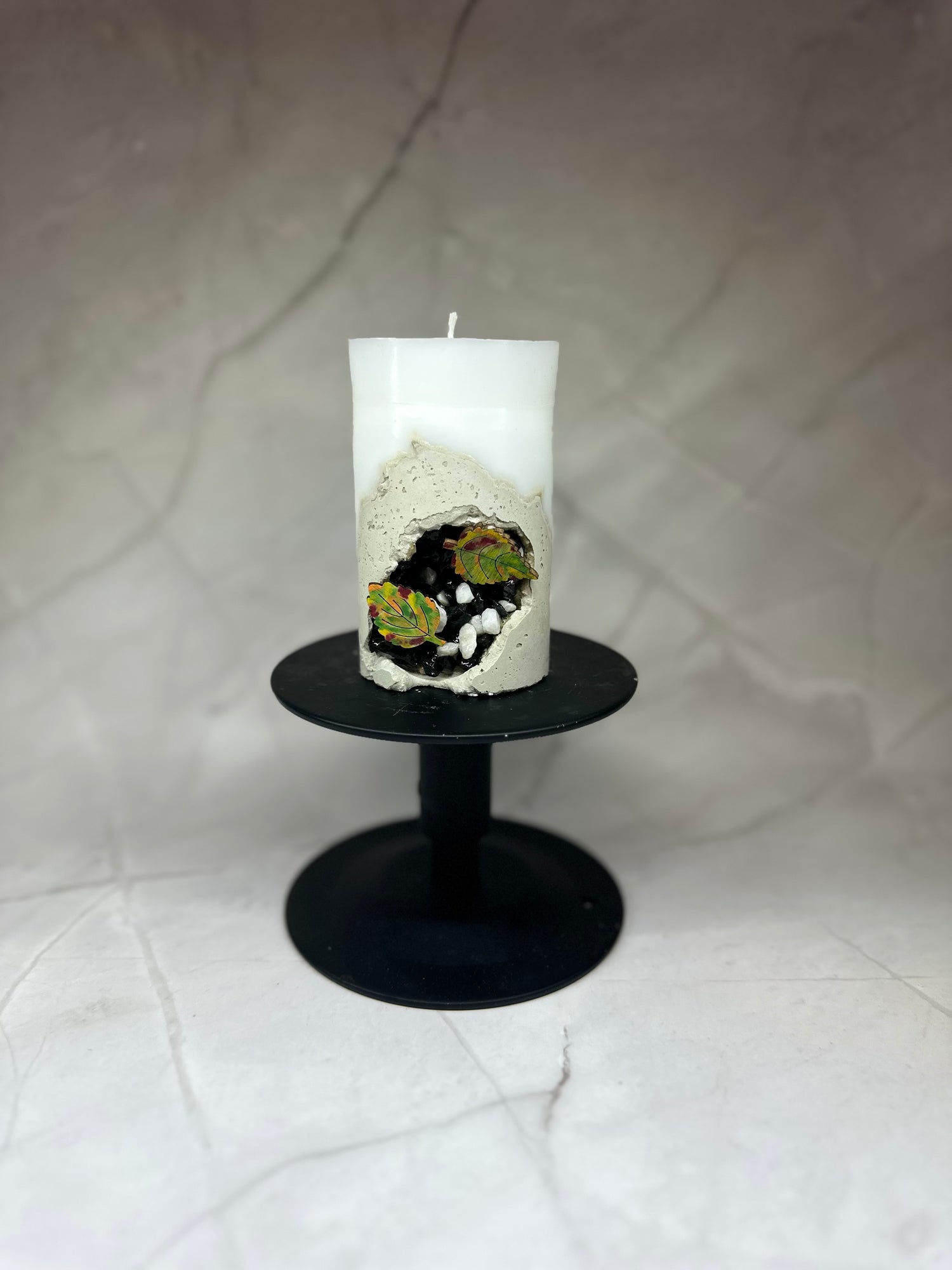 Bougies avec une base en béton, décorées de pierres et de fleurs d'été.