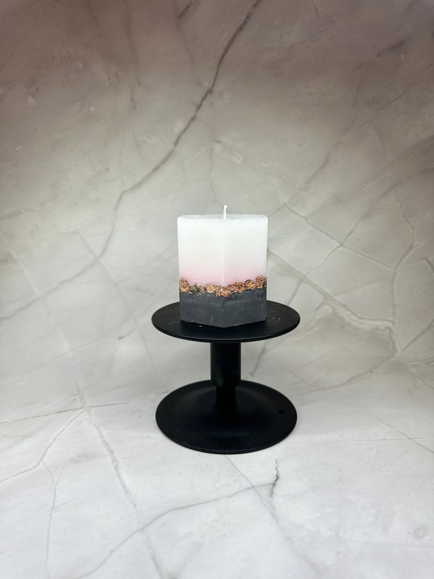 Bougies minimalistes sur socle en béton, certaines ornées d’un délicat détail doré pour une atmosphère élégante. Idéales pour des espaces modernes et minimalistes.