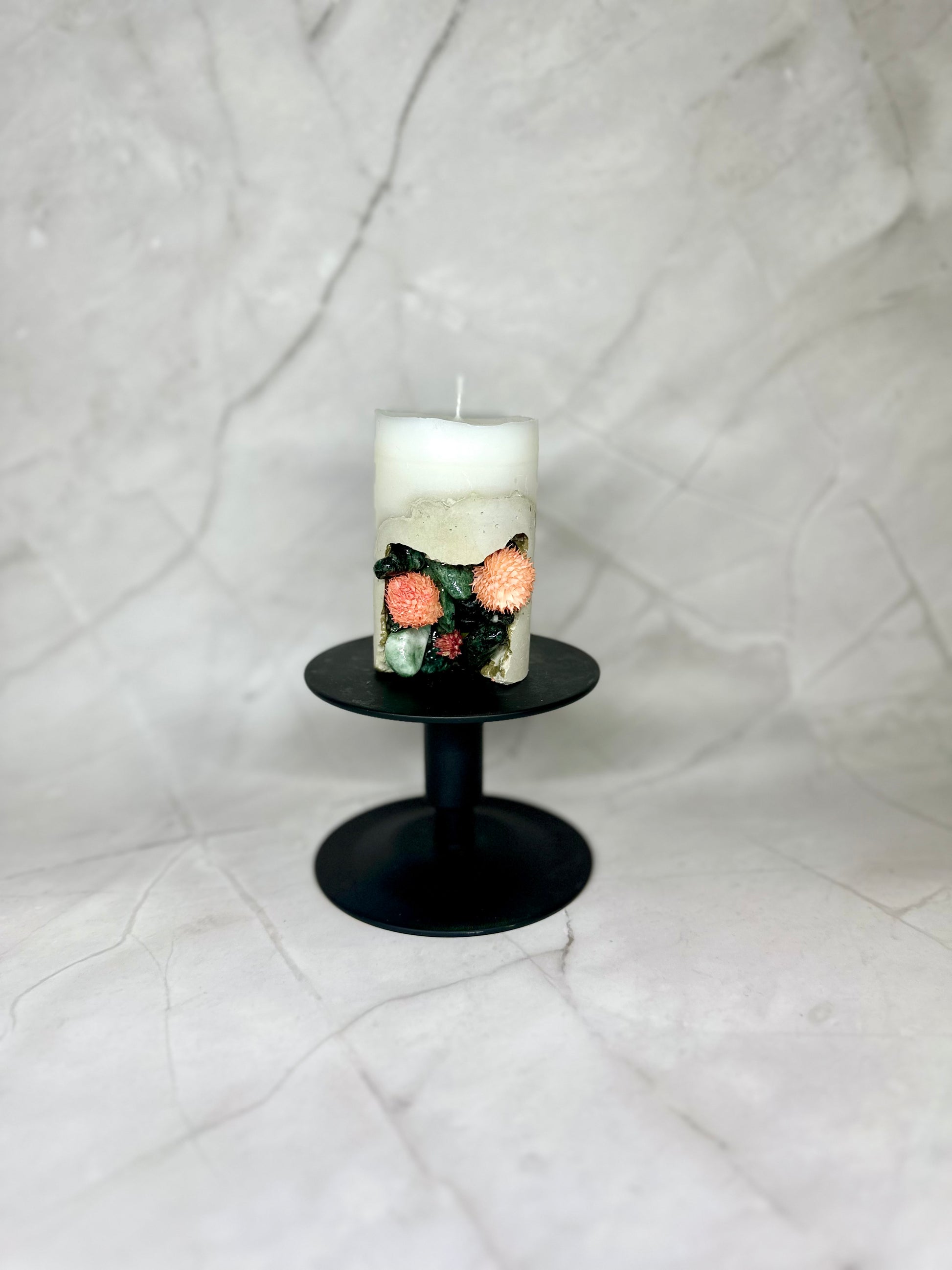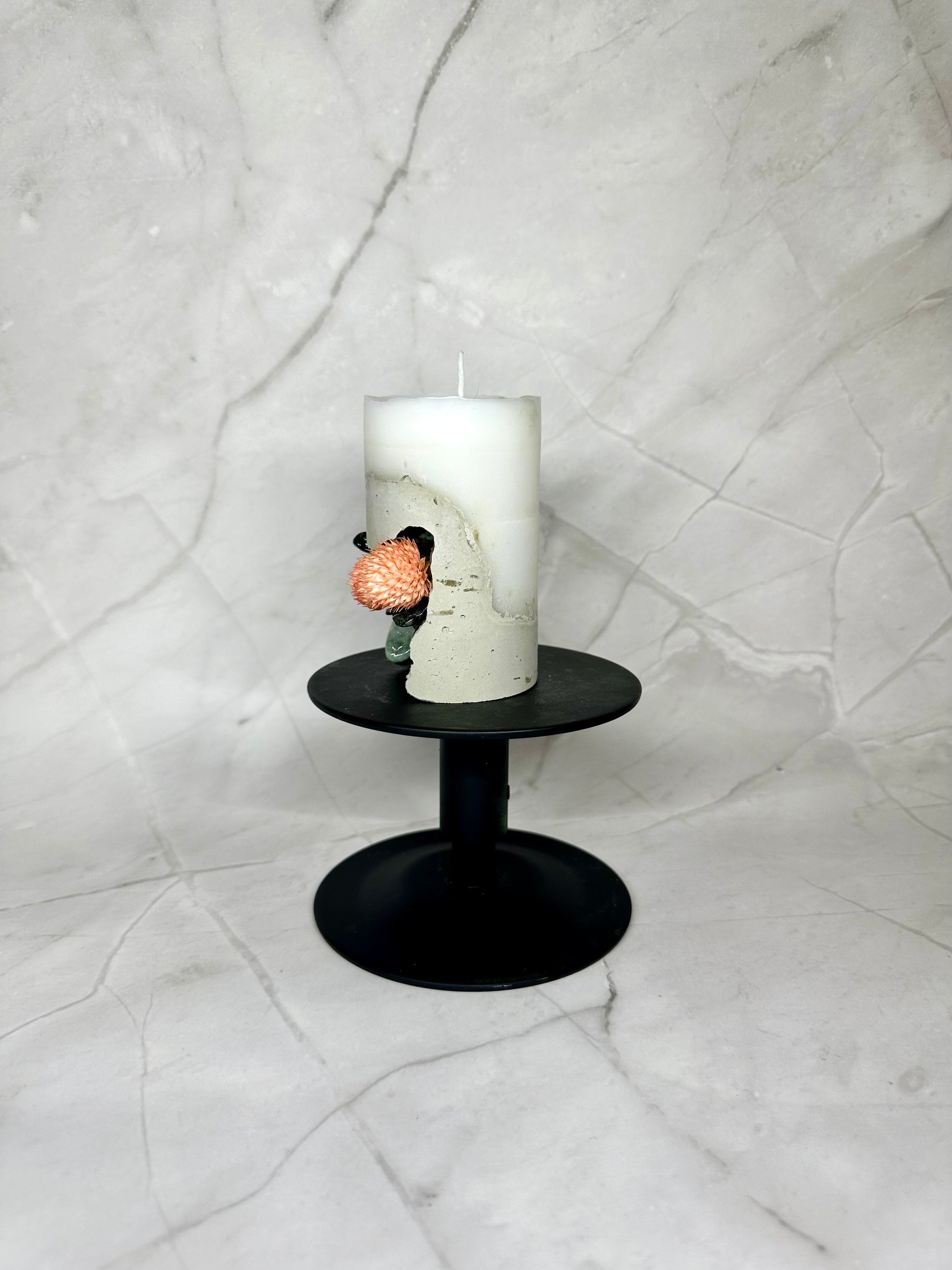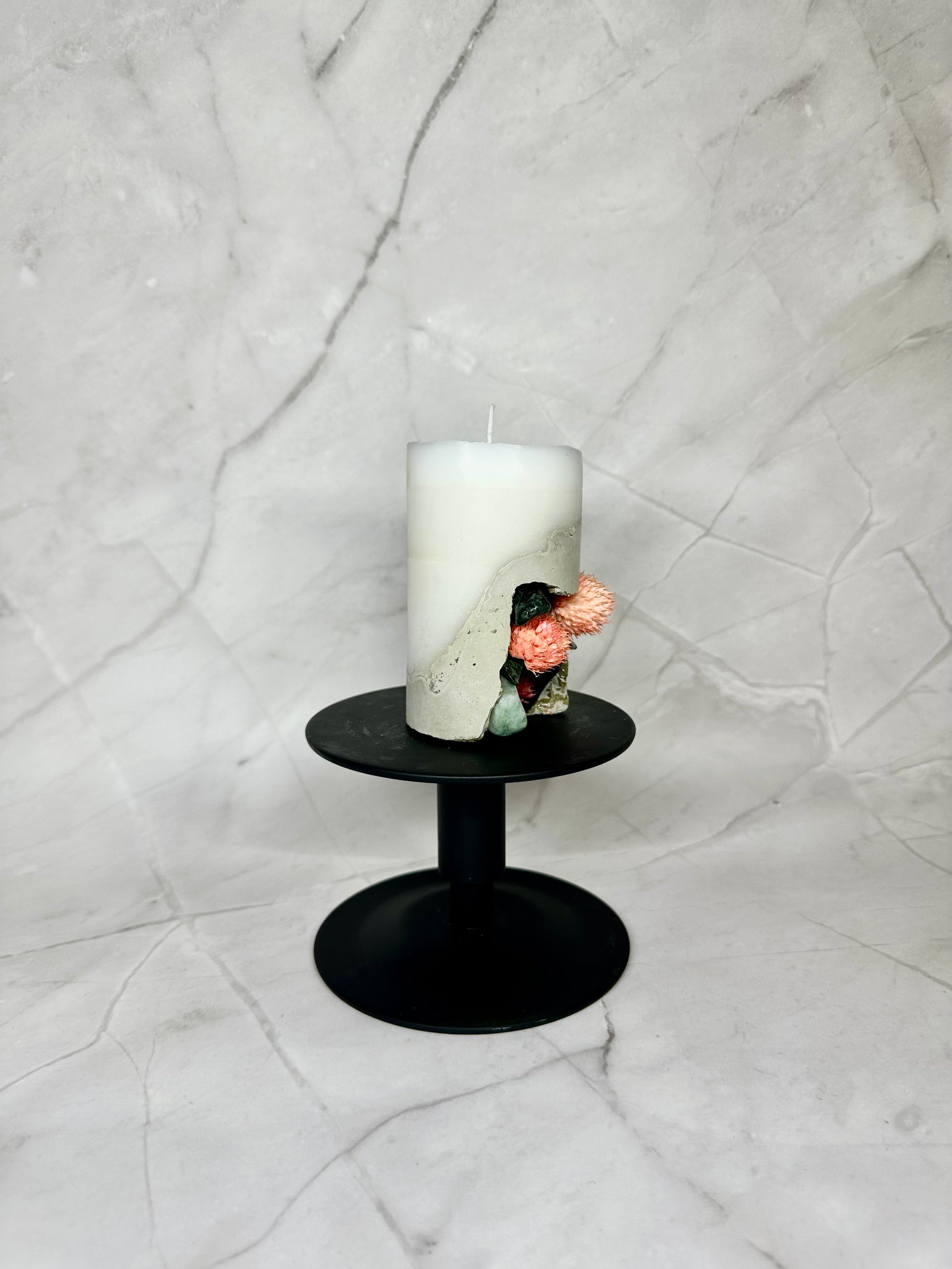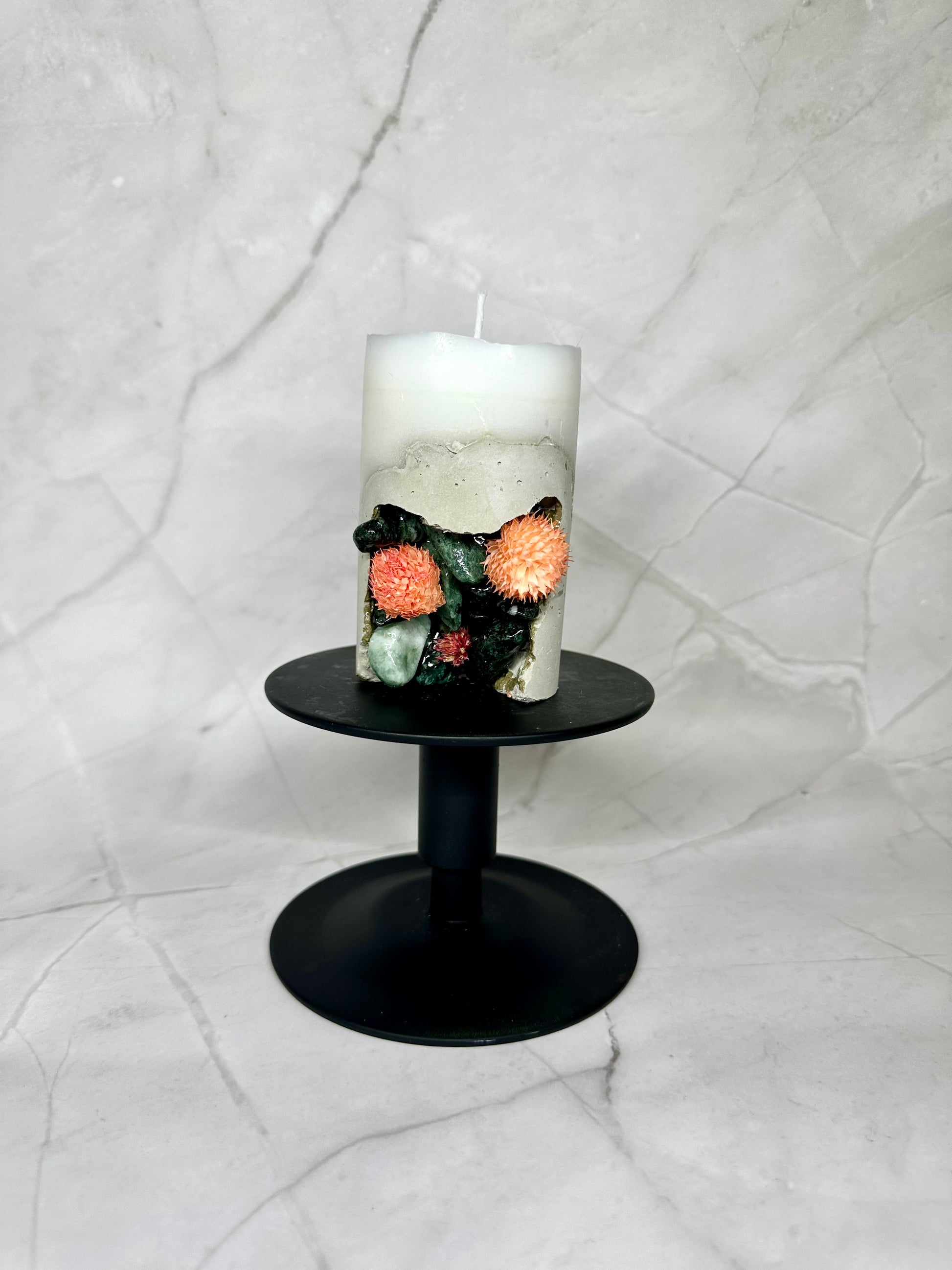Bougie en paraffine/stéarine avec base en béton, décorée de pierres naturelles et de fleurs séchées.