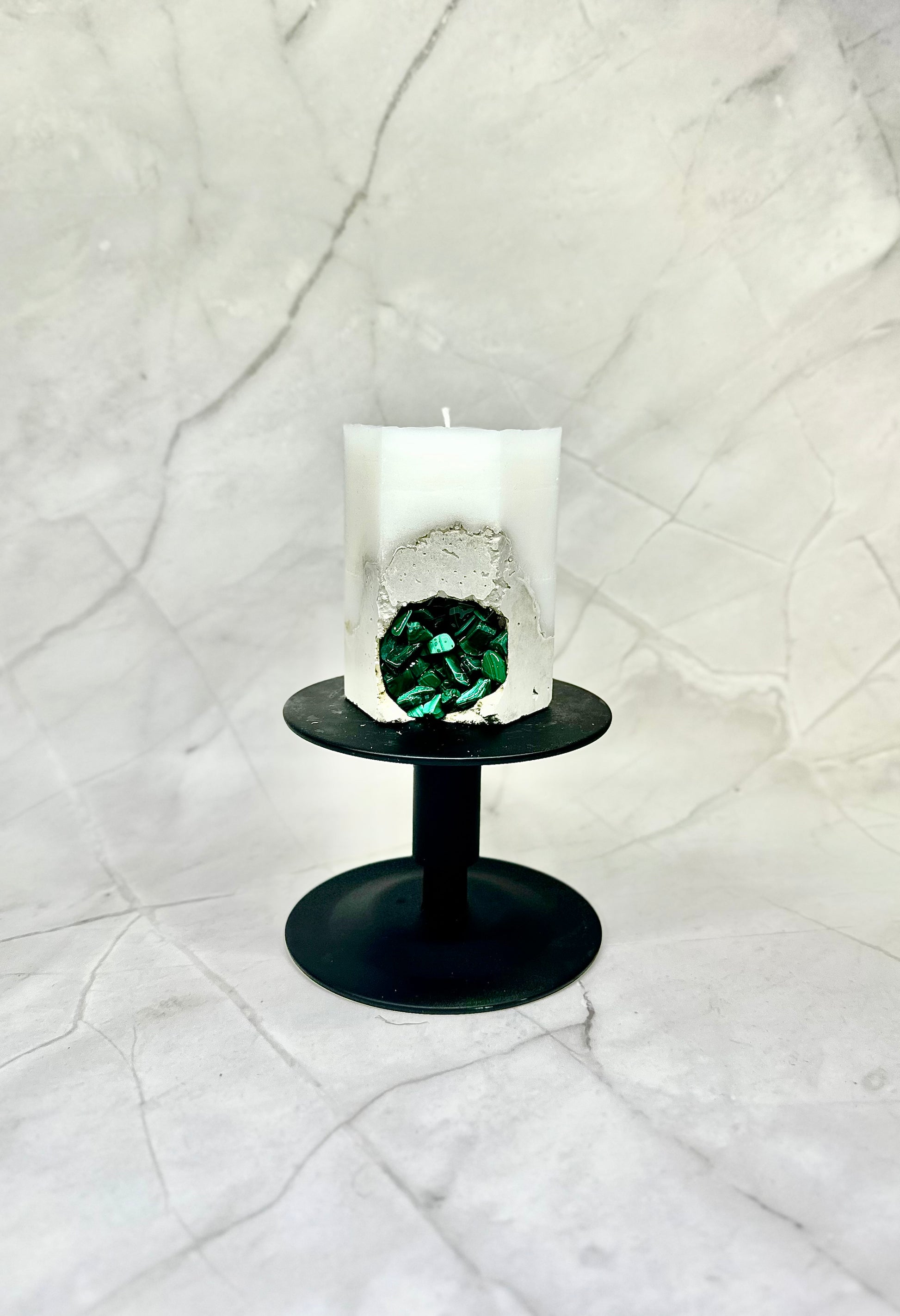 Bougie en paraffine/stéarine sur socle en béton décorée d'agate verte.