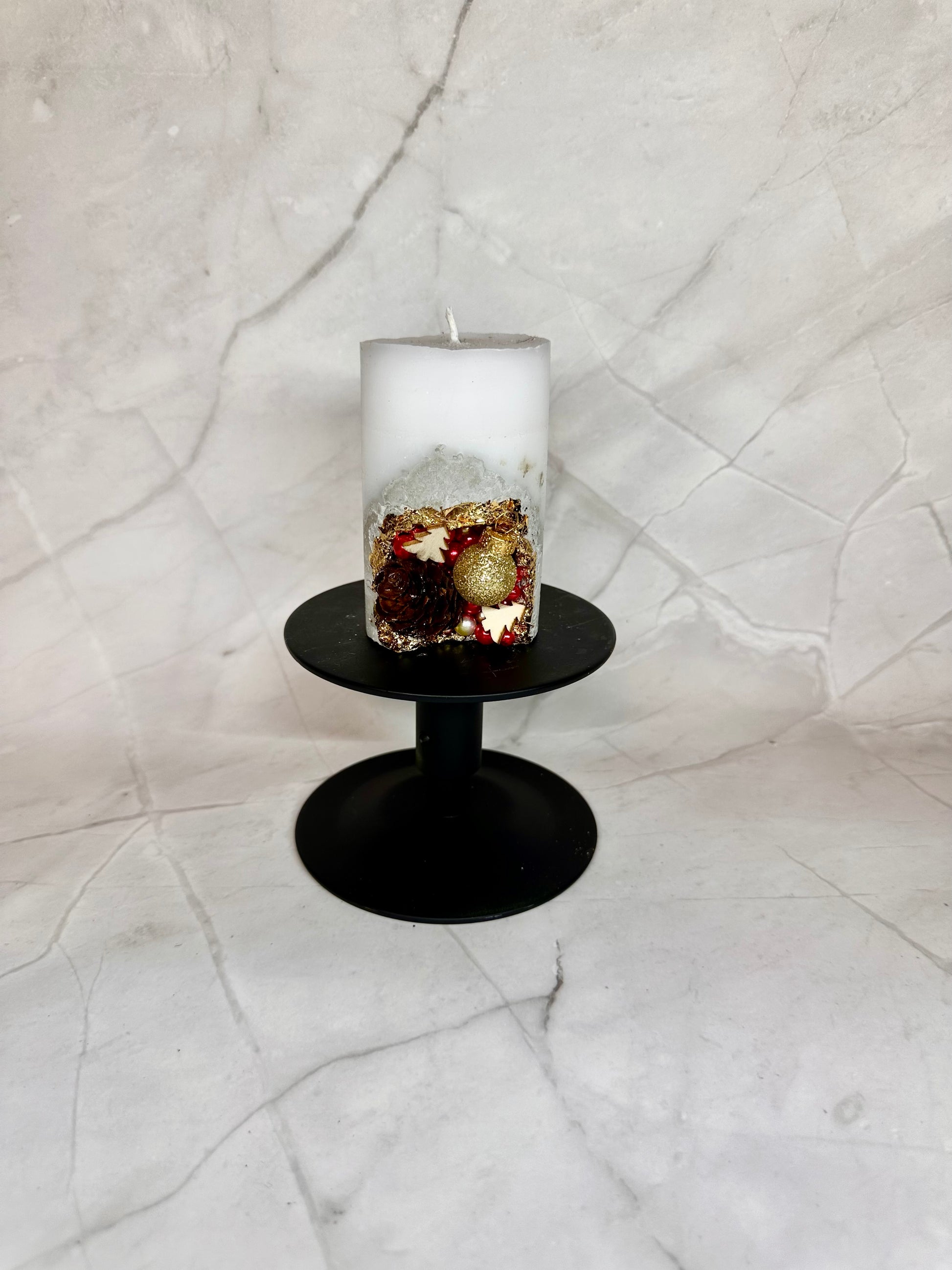 Chaque bougie est décorée à la main avec de petits motifs de Noël – pommes de pin, étoiles, perles et décorations scintillantes.