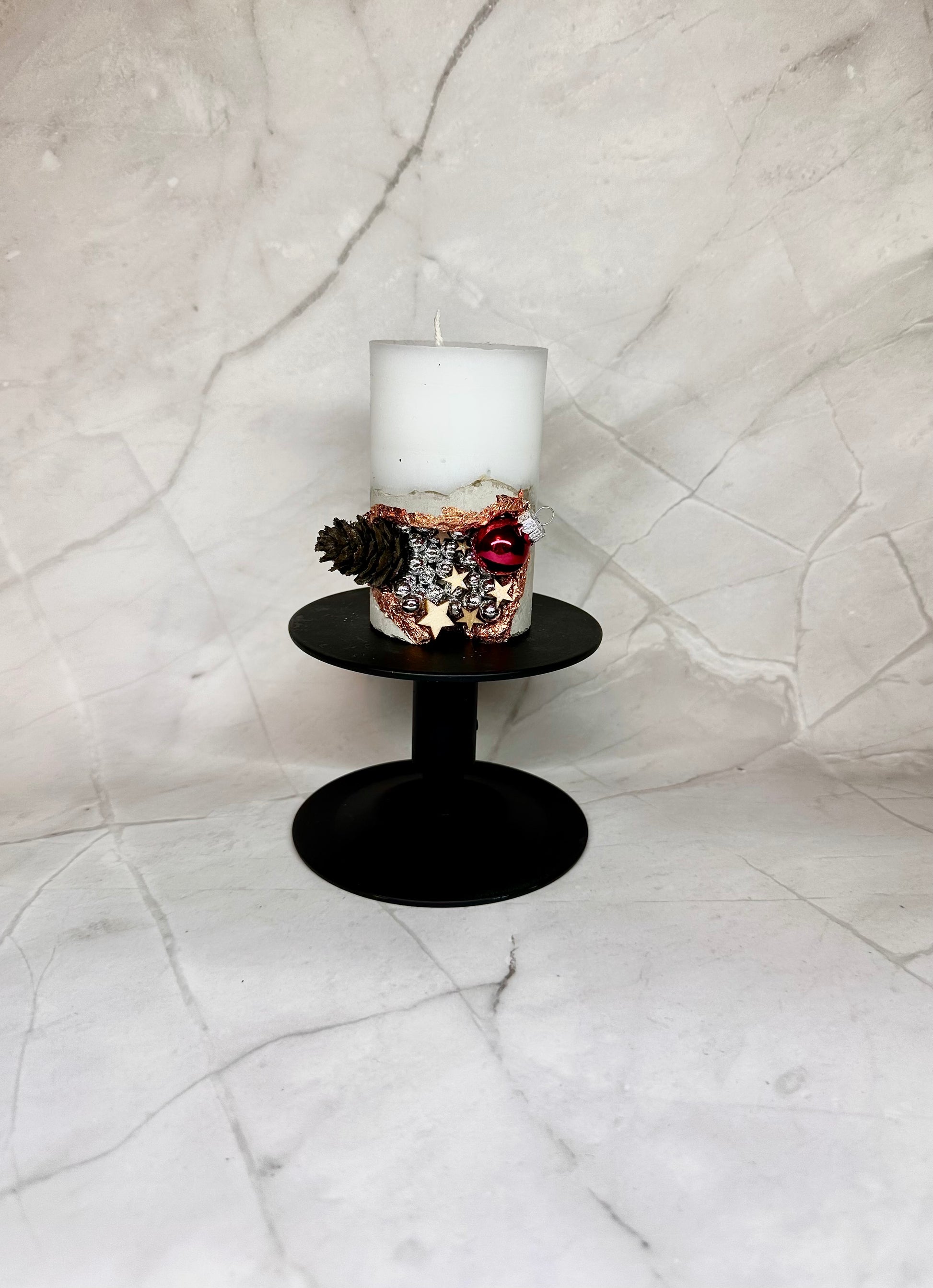 Chaque bougie est décorée à la main avec de petits motifs de Noël – pommes de pin, étoiles, perles et décorations scintillantes.