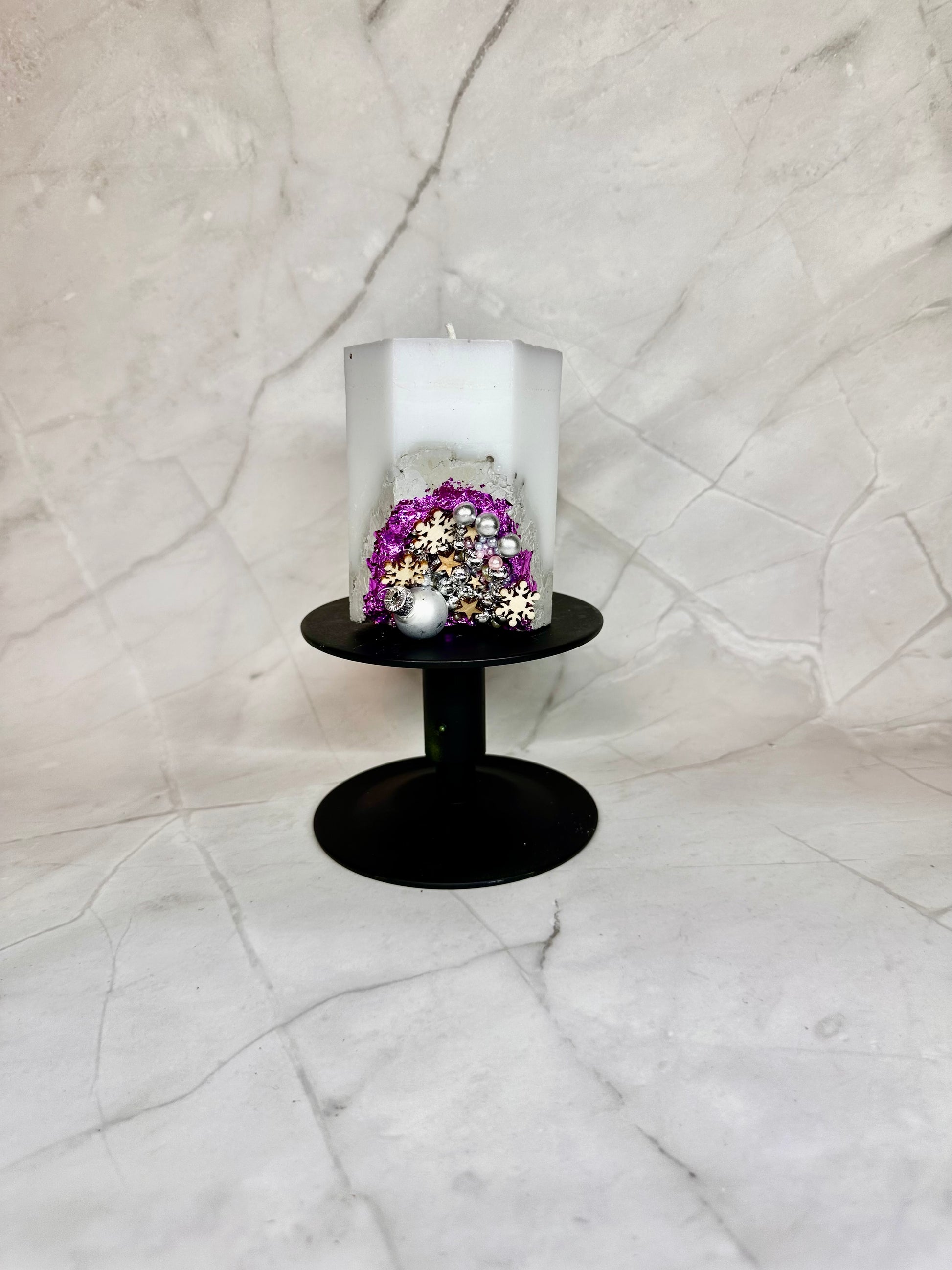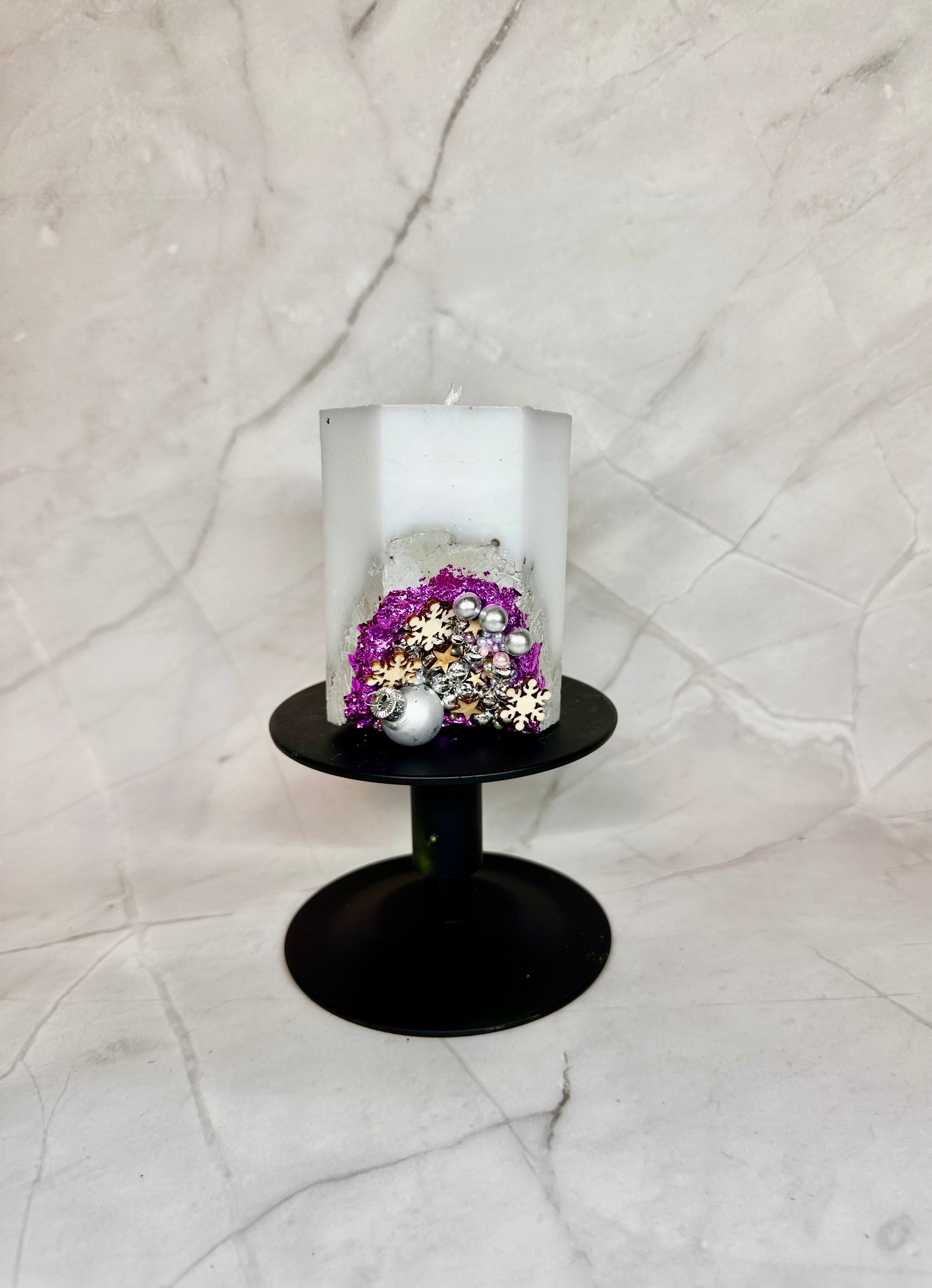 Chaque bougie est décorée à la main avec de petits motifs de Noël – pommes de pin, étoiles, perles et décorations scintillantes.