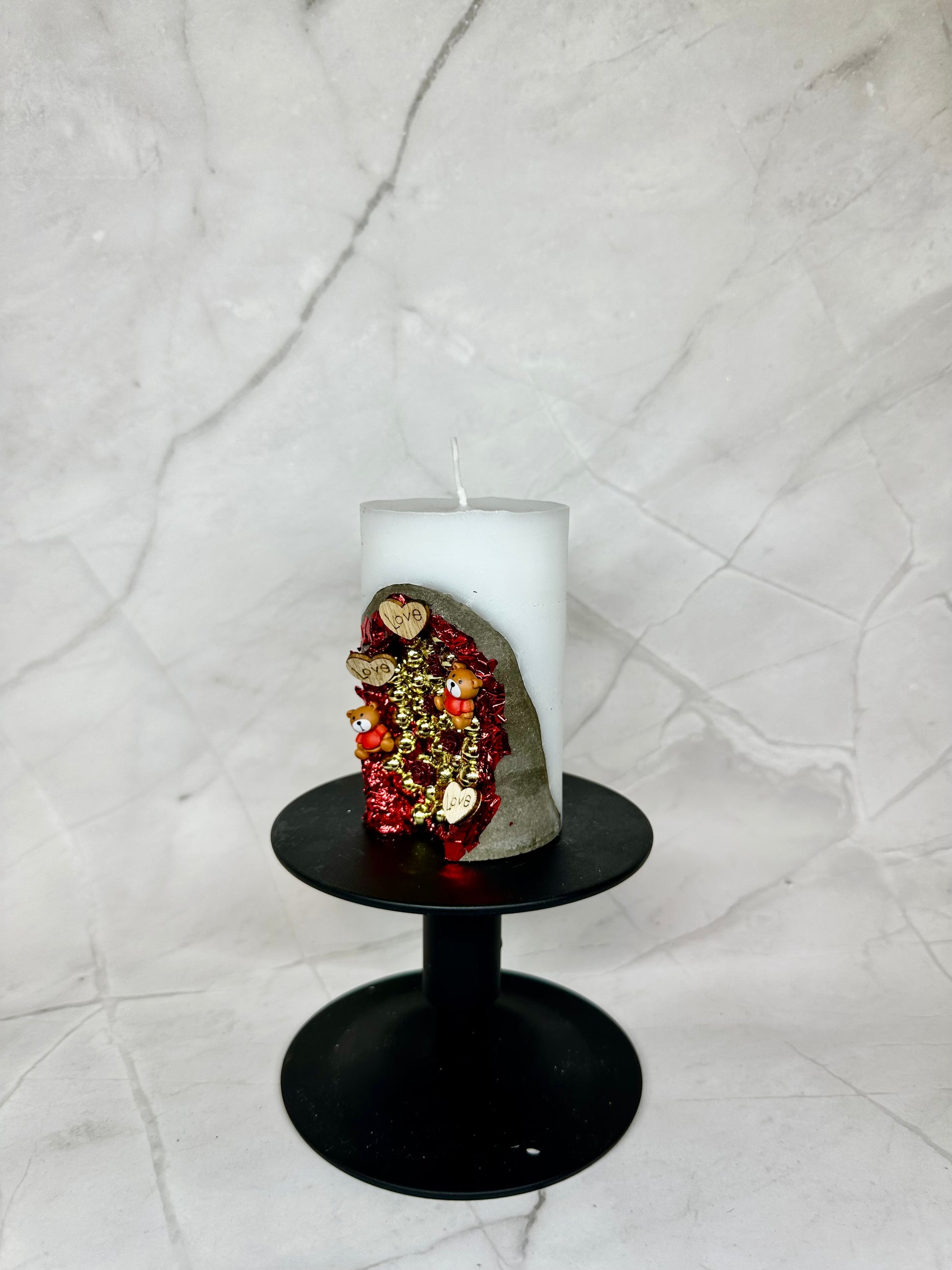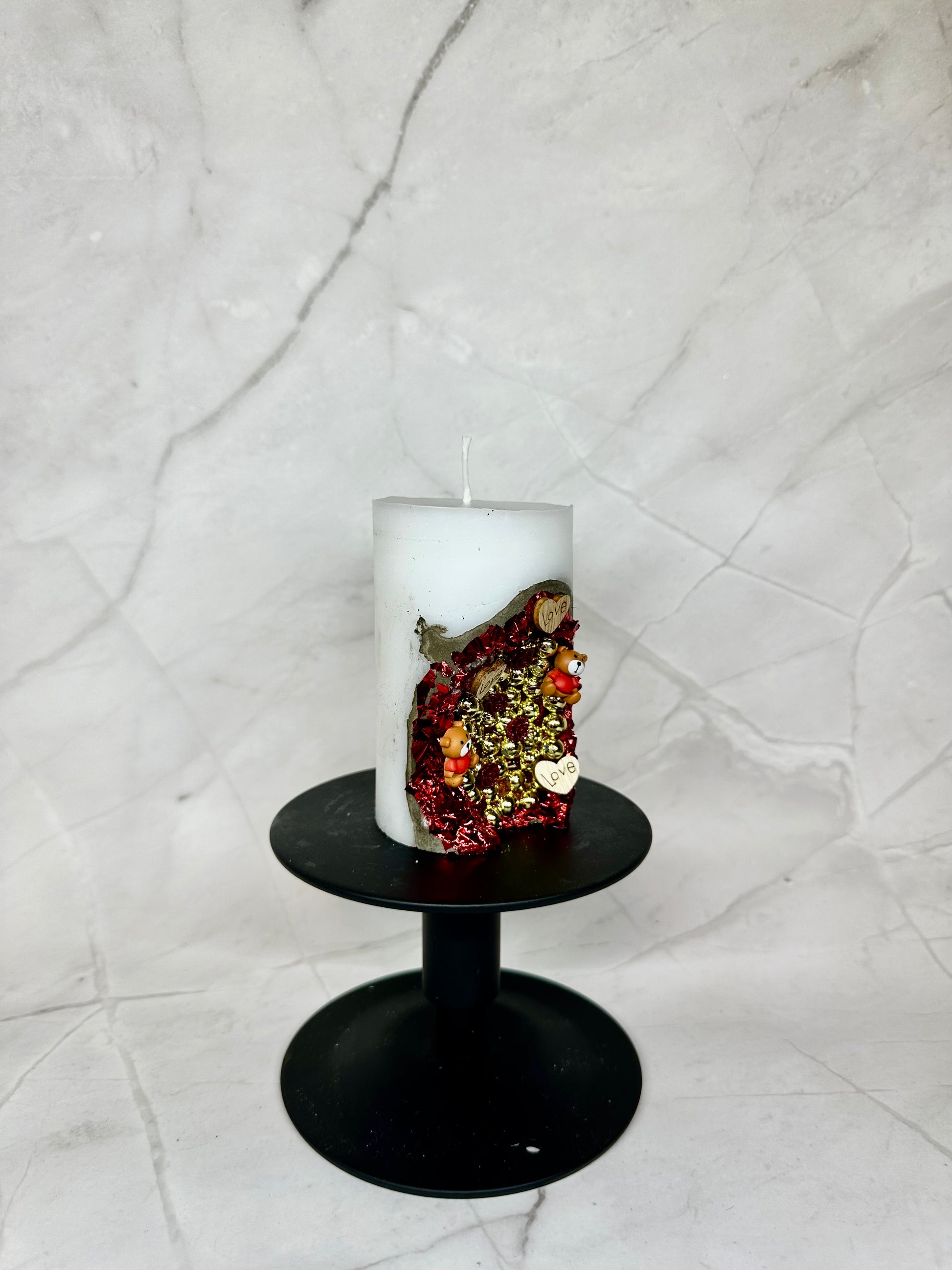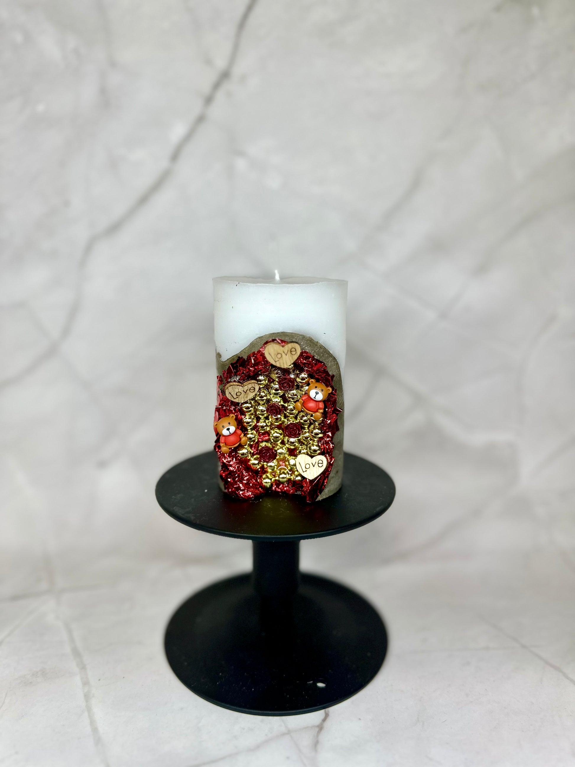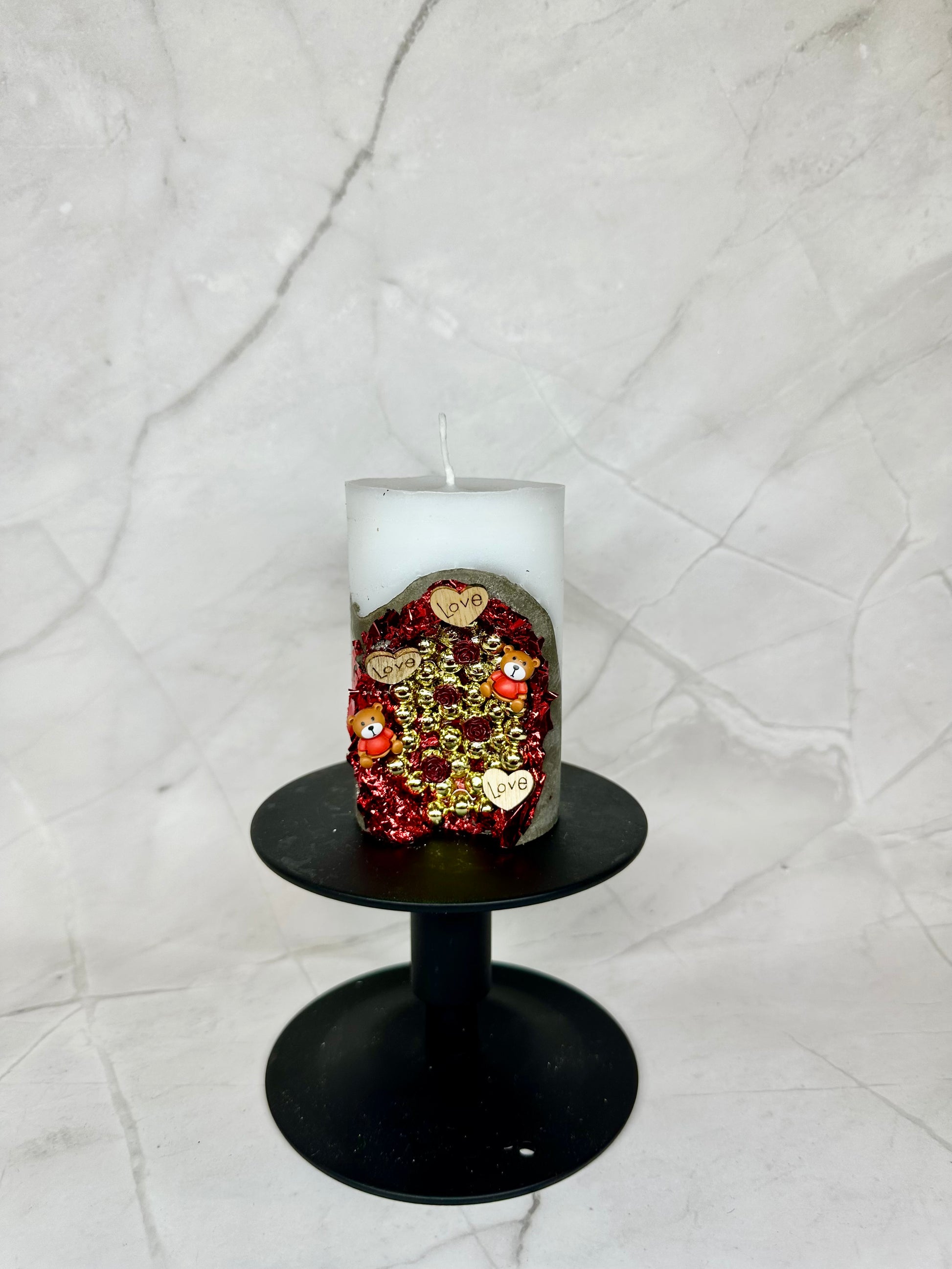 Bougie en paraffine/stéarine décorée de motifs de Saint-Valentin. Il convient également comme décoration pour les mariages ou comme petit cadeau de mariage.