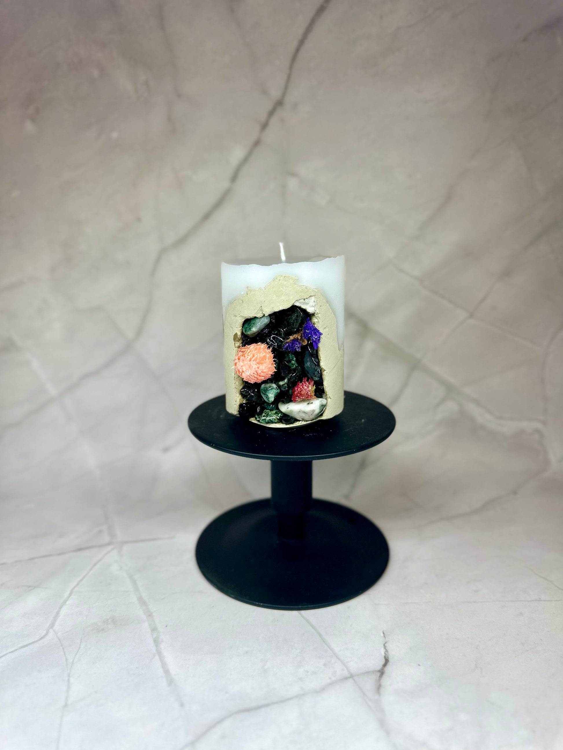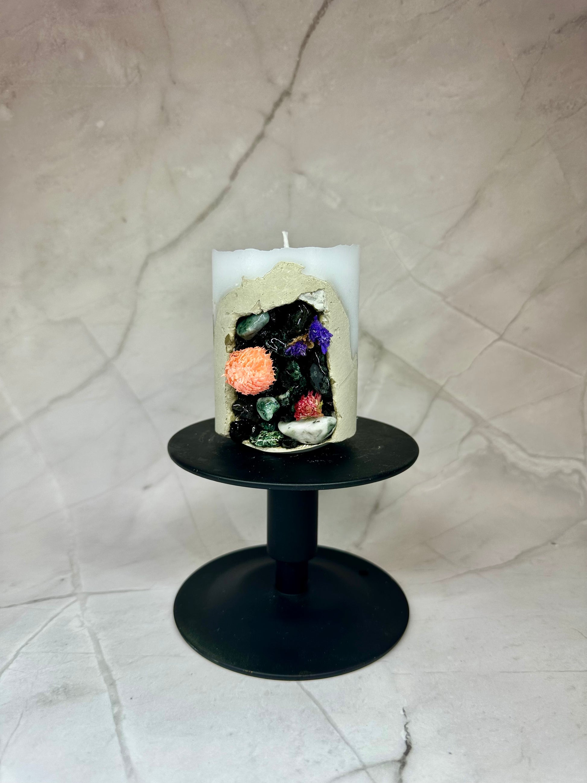 Élégante et naturelle, cette bougie artisanale se distingue par sa base en béton brut, dans laquelle sont délicatement incrustées des pierres naturelles. Sa surface est sublimée par de fleurs séchées soigneusement sélectionnées, apportant une touche végétale et poétique à l’ensemble.