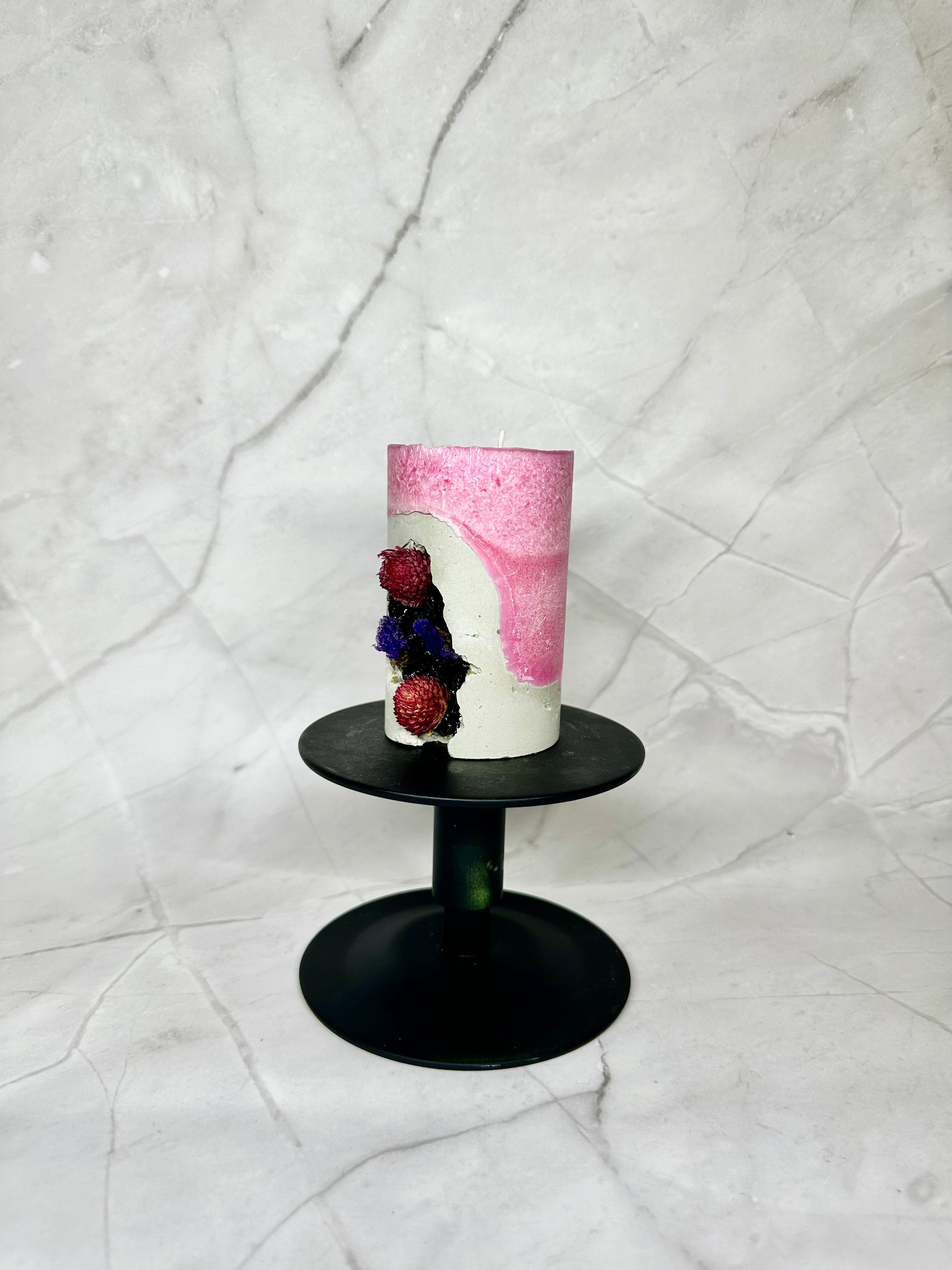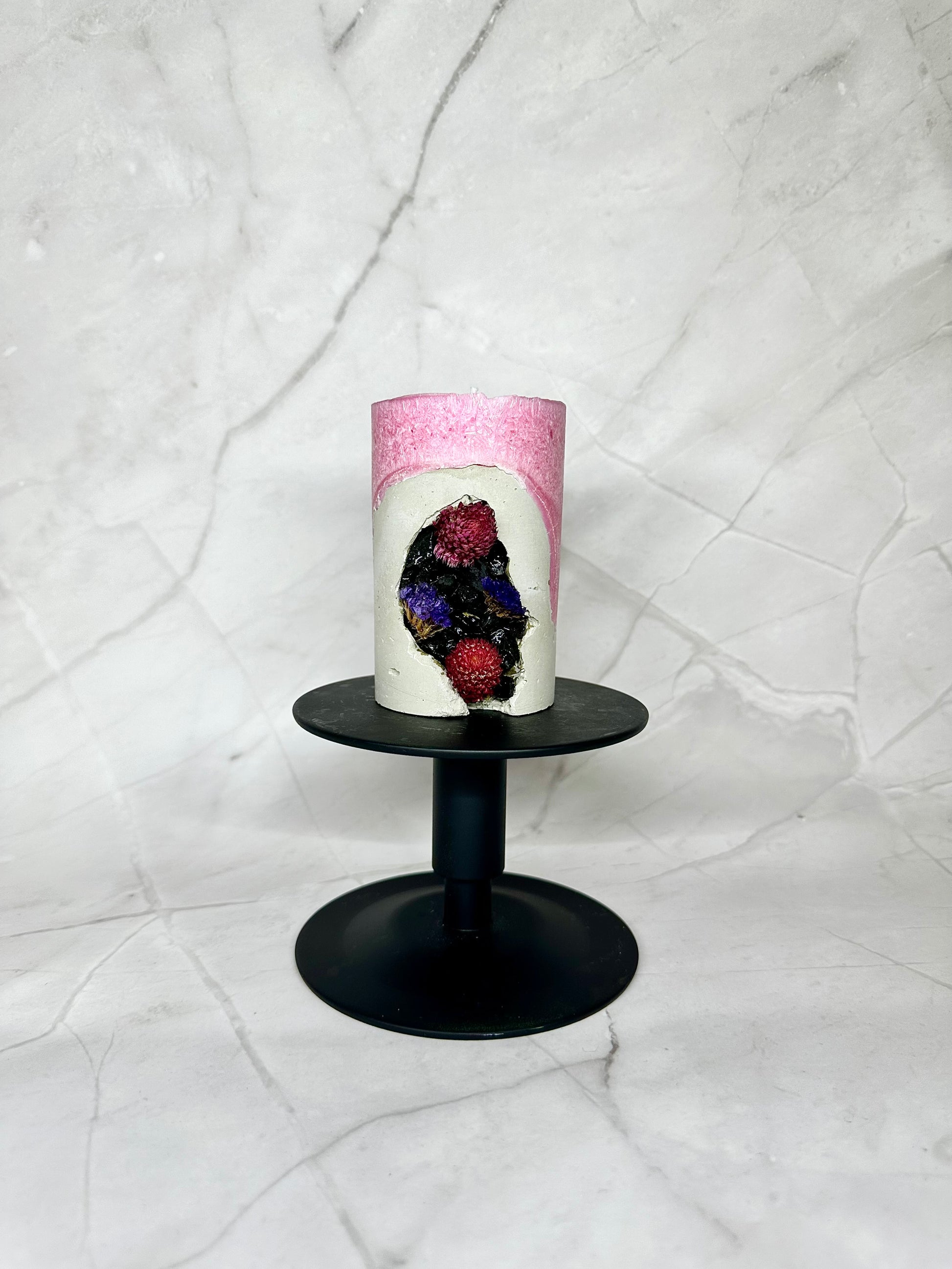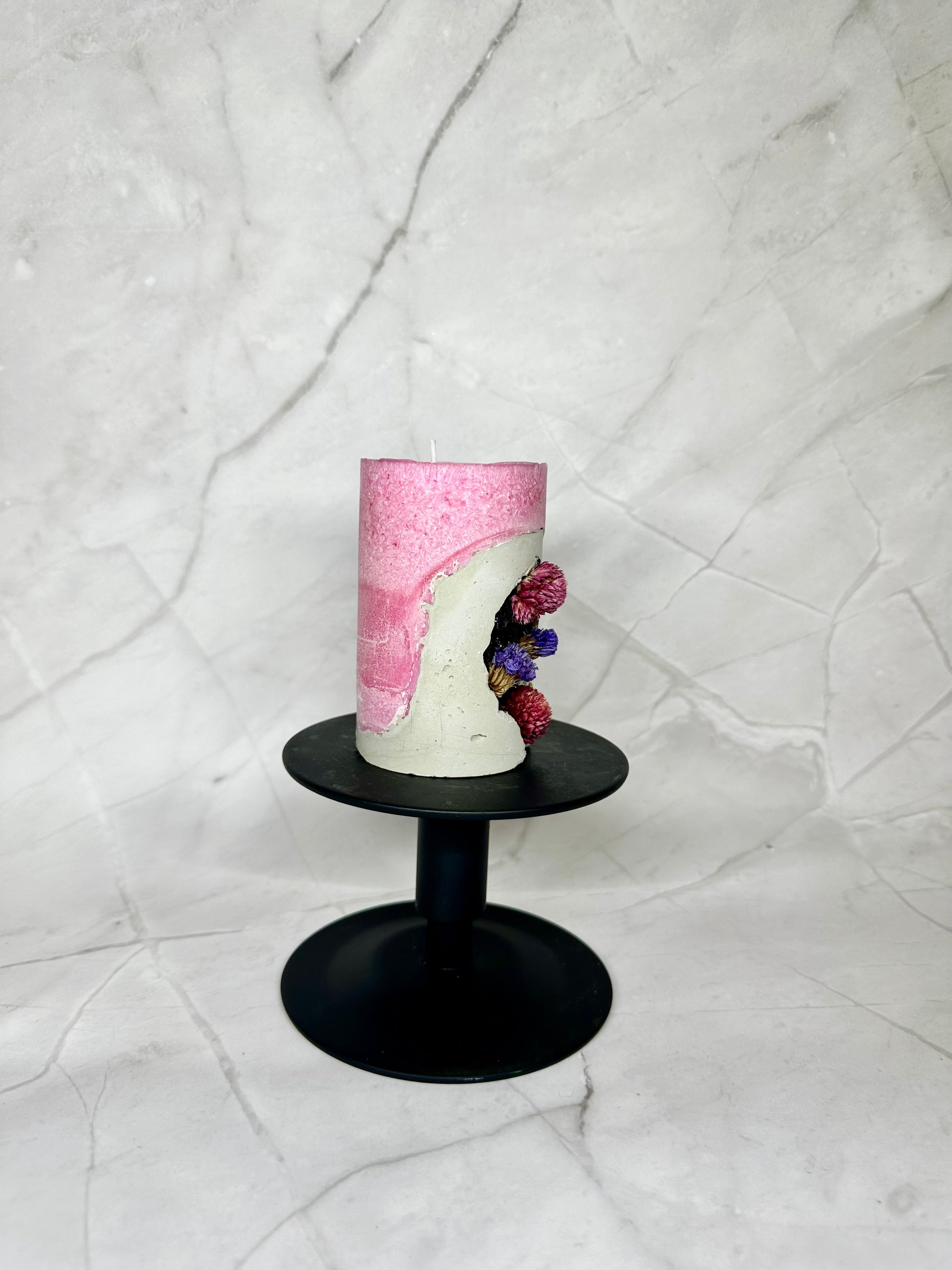 Bougie rose en cire d´olive avec base en béton, décorée de pierres naturelles et de fleurs séché.