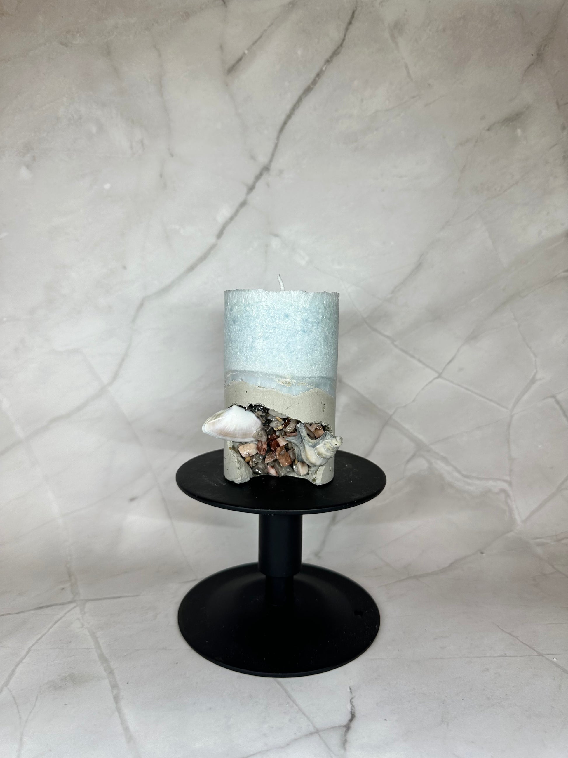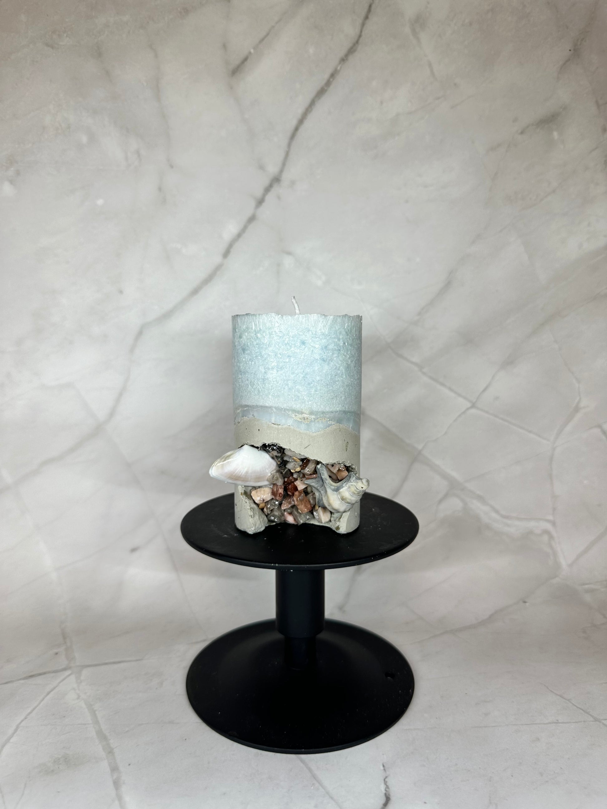Une bougie minimaliste aux dégradés doux de bleu et de sable, qui vous transporte sur une plage paisible au coucher du soleil. Sur sa face avant, une composition marine artisanale intègre de véritables coquillages, du sable fin, de petits galets. L’ensemble évoque un fragment de littoral figé dans le temps.