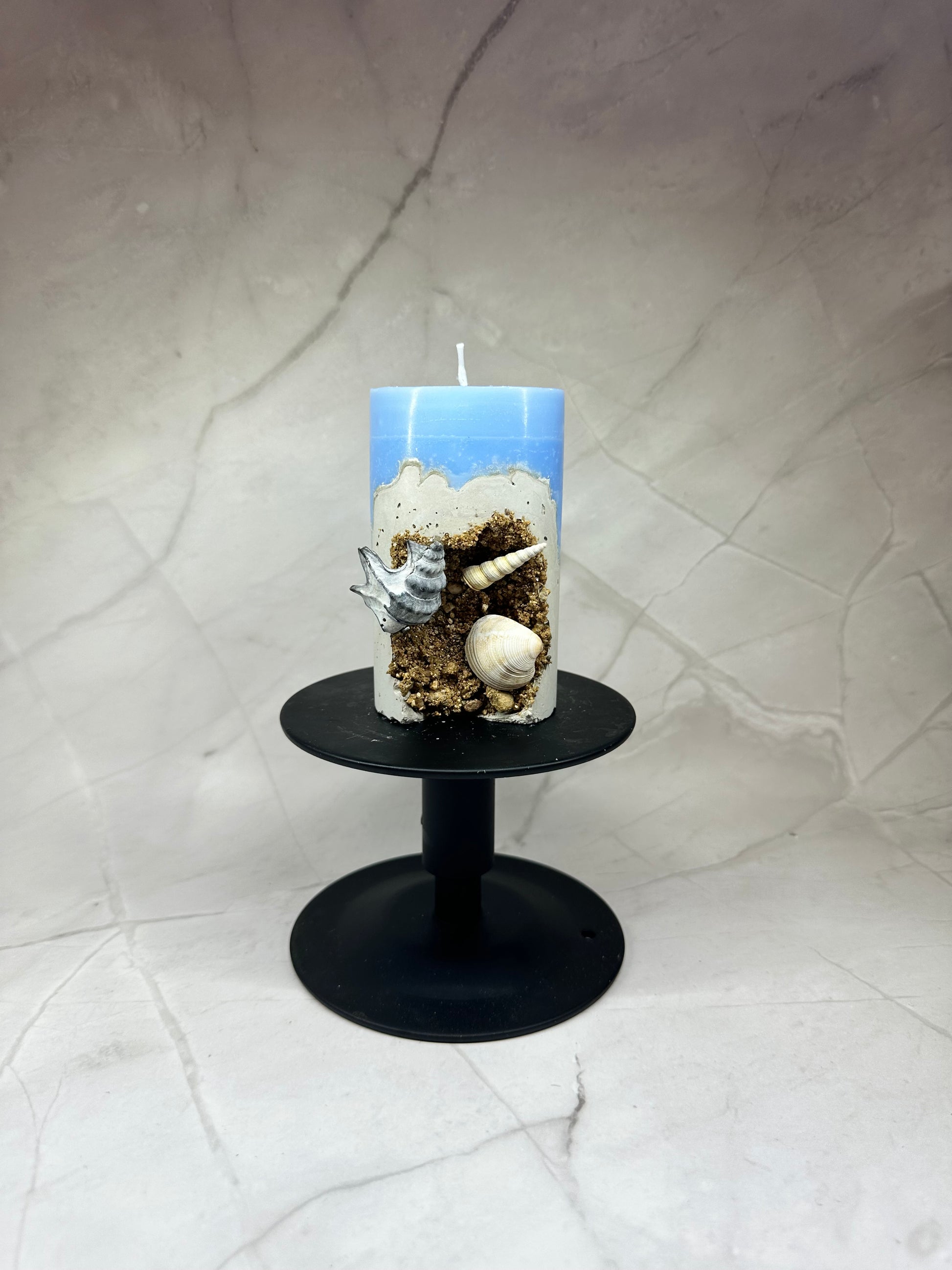 Une bougie minimaliste aux dégradés doux de bleu et de sable, qui vous transporte sur une plage paisible au coucher du soleil. Sur sa face avant, une composition marine artisanale intègre de véritables coquillages, du sable fin, de petits galets et un. L’ensemble évoque un fragment de littoral figé dans le temps.