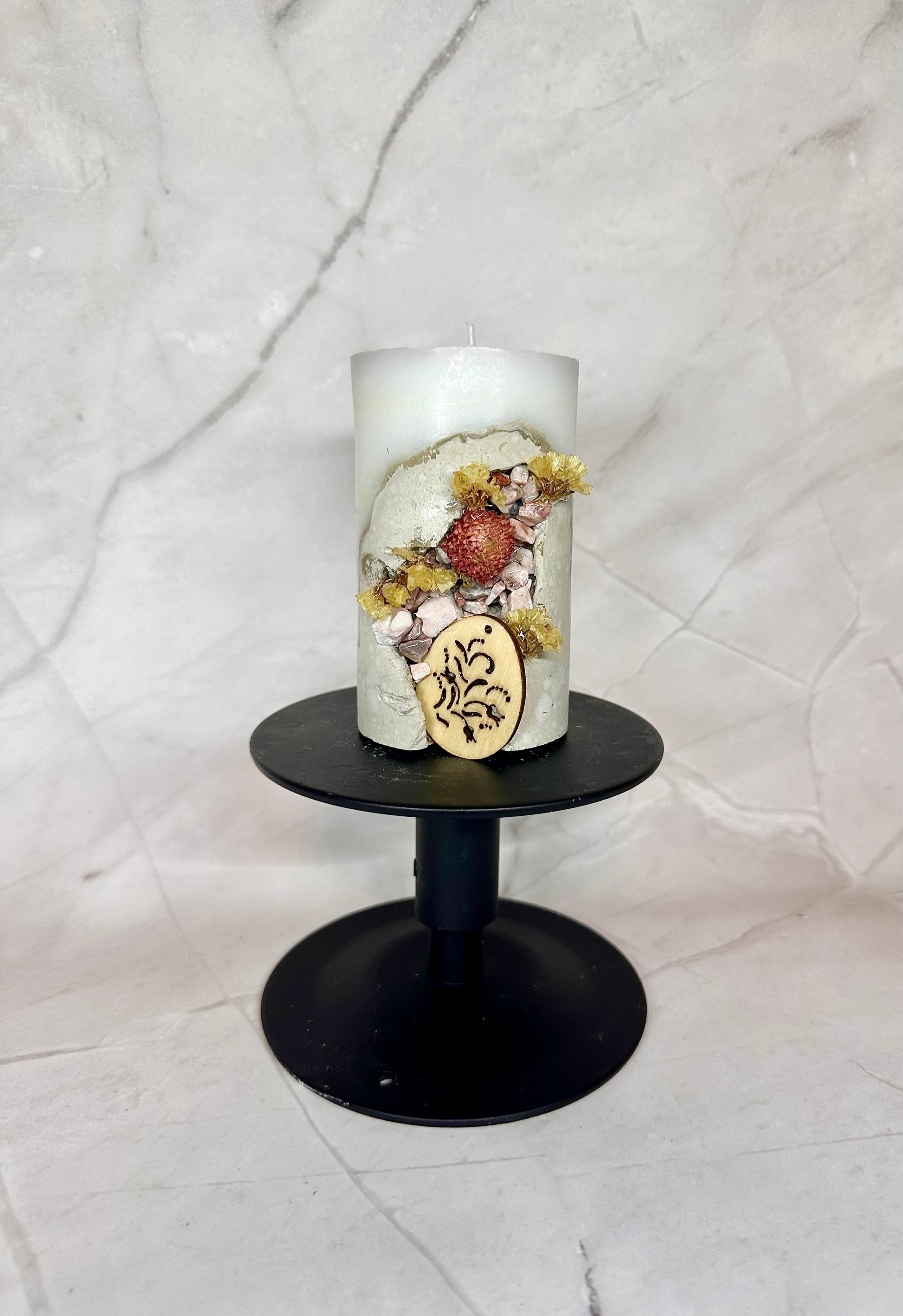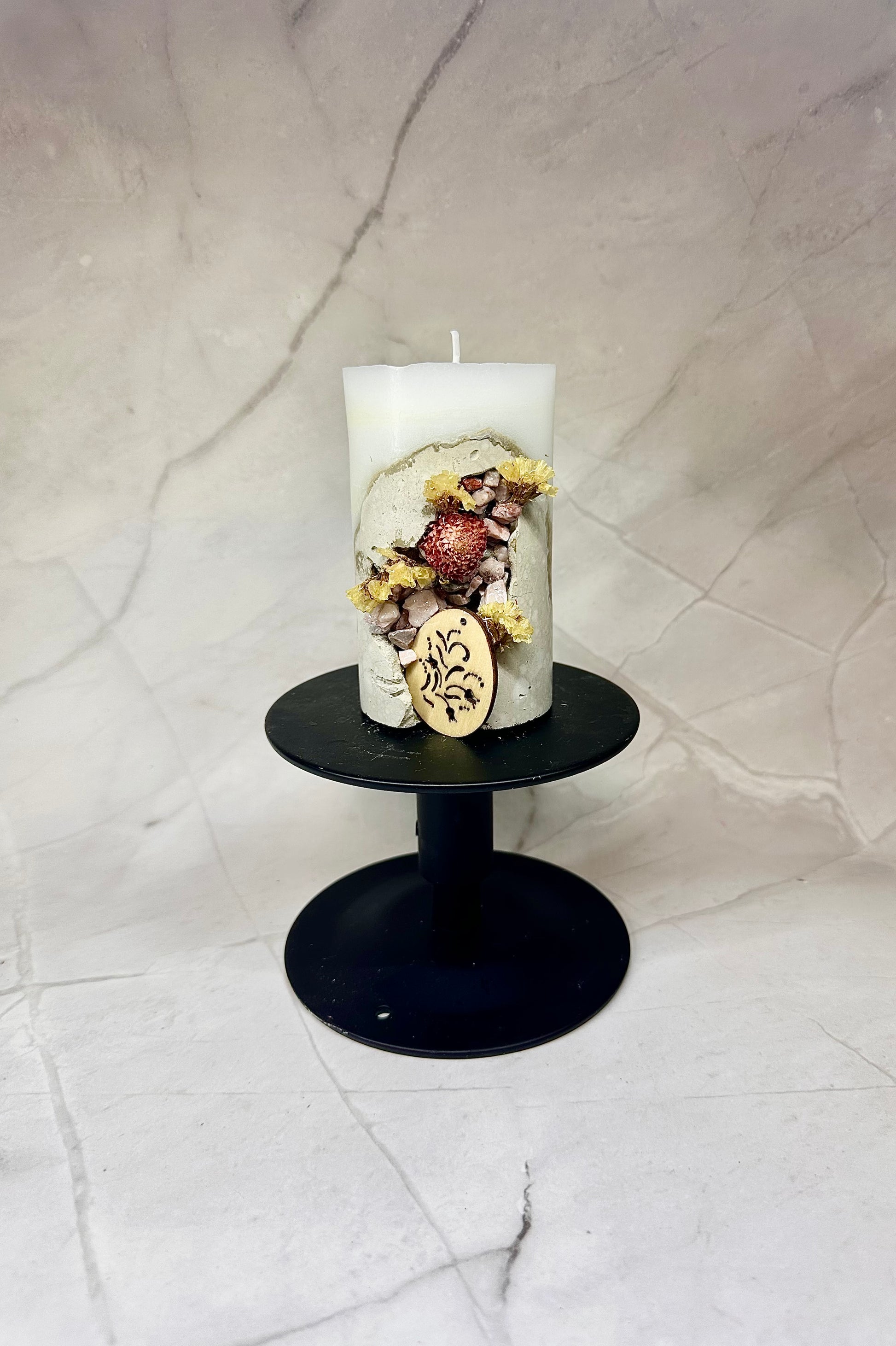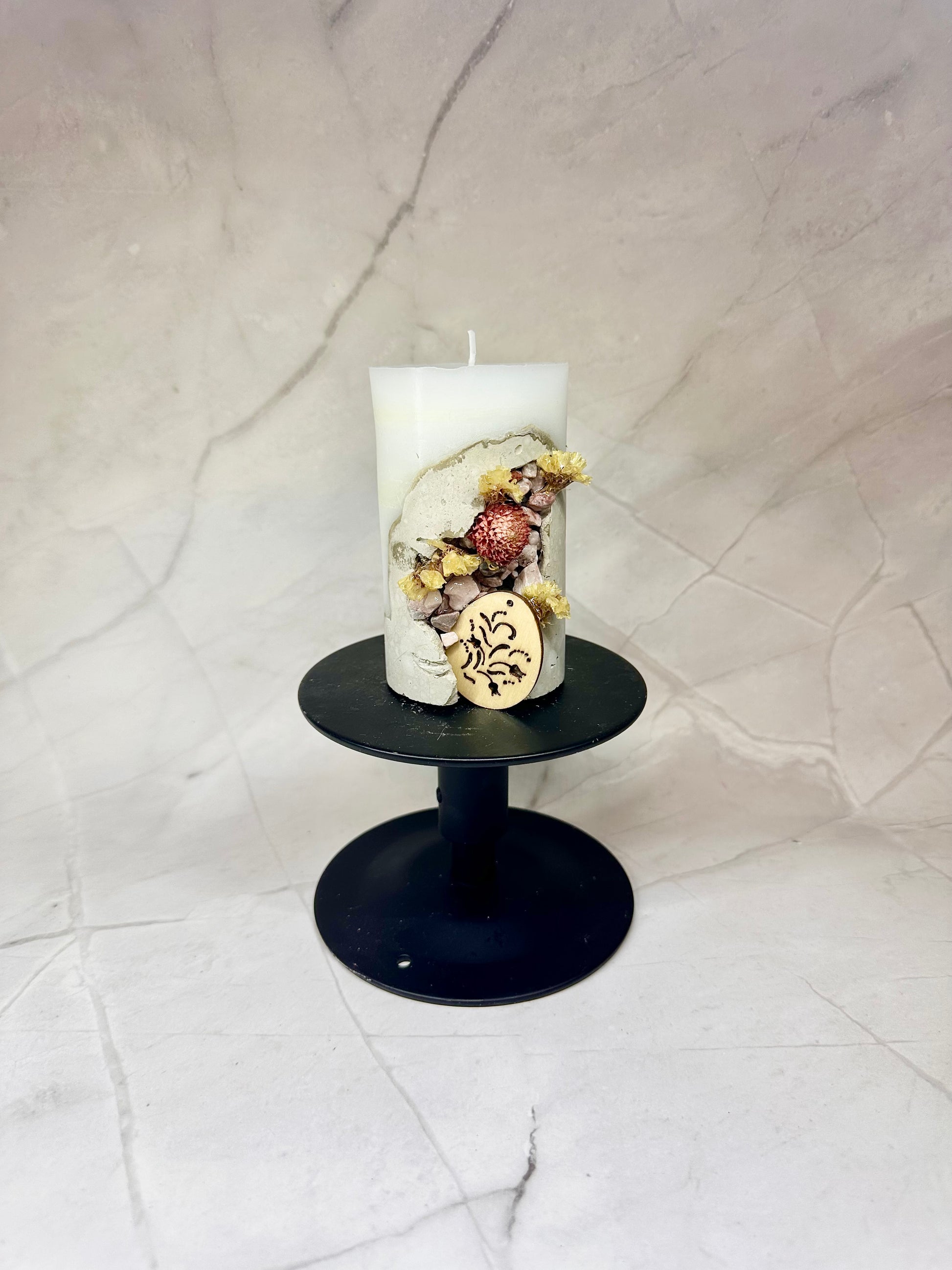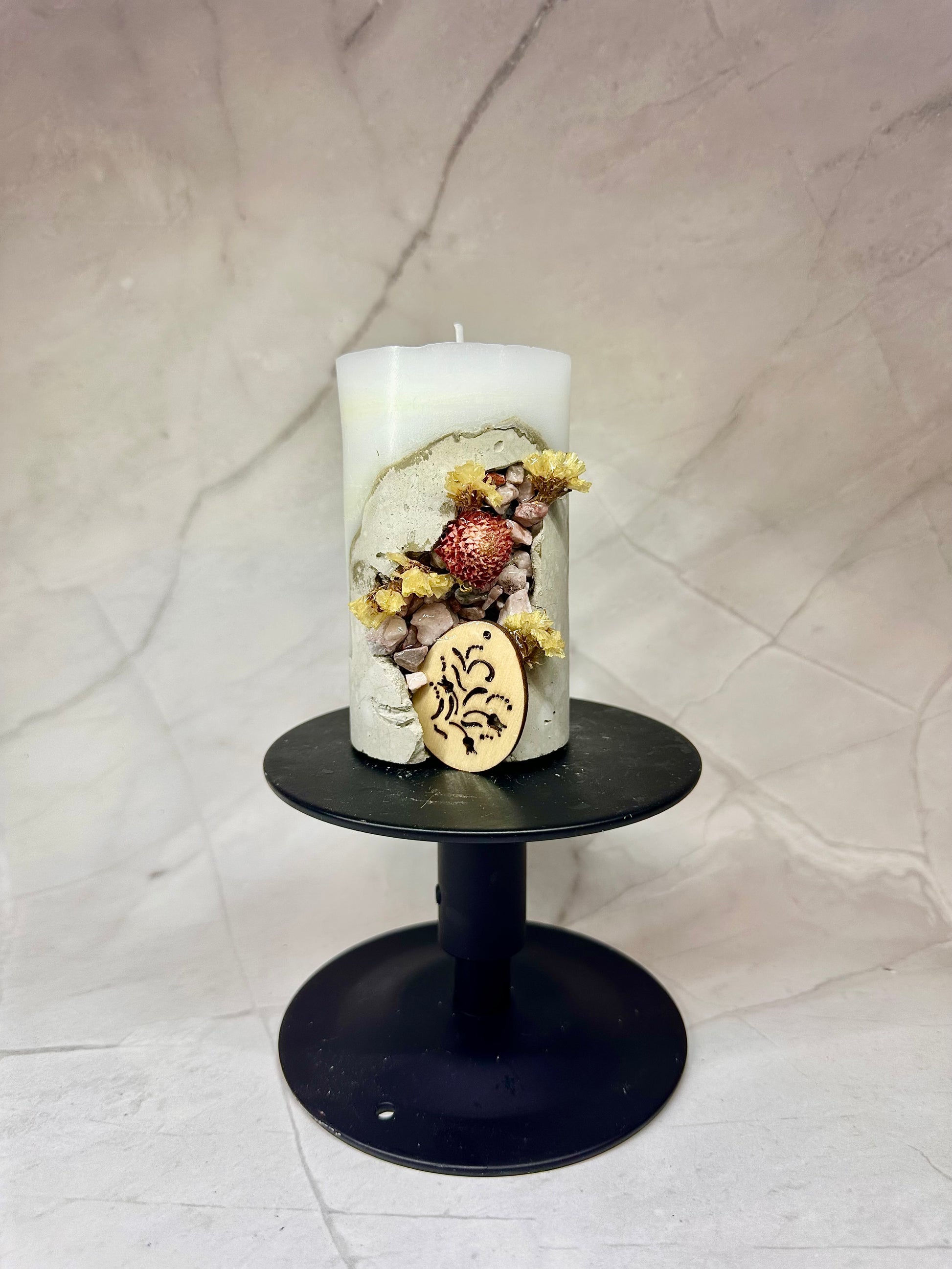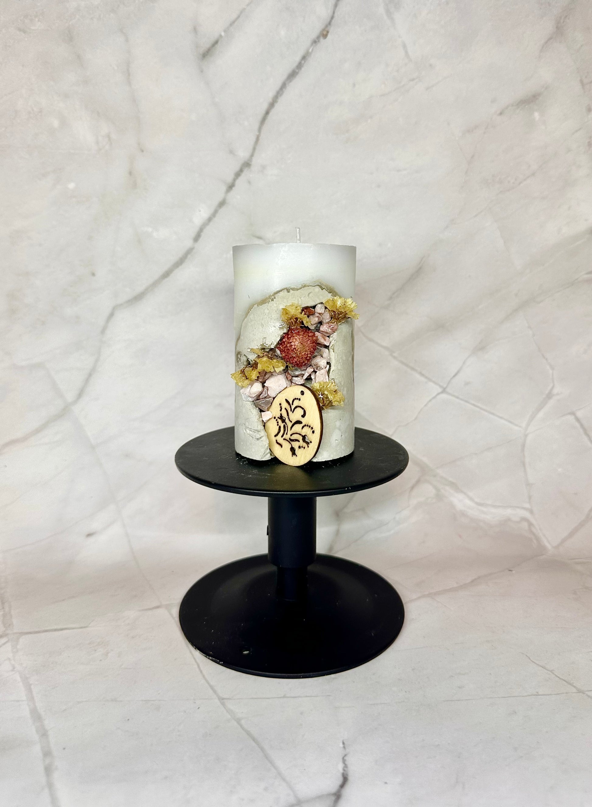 Une bougie en paraffine/stéarine avec une base en béton, décorée de pierres et de fleurs séchées, ainsi que d’un œuf en bois.