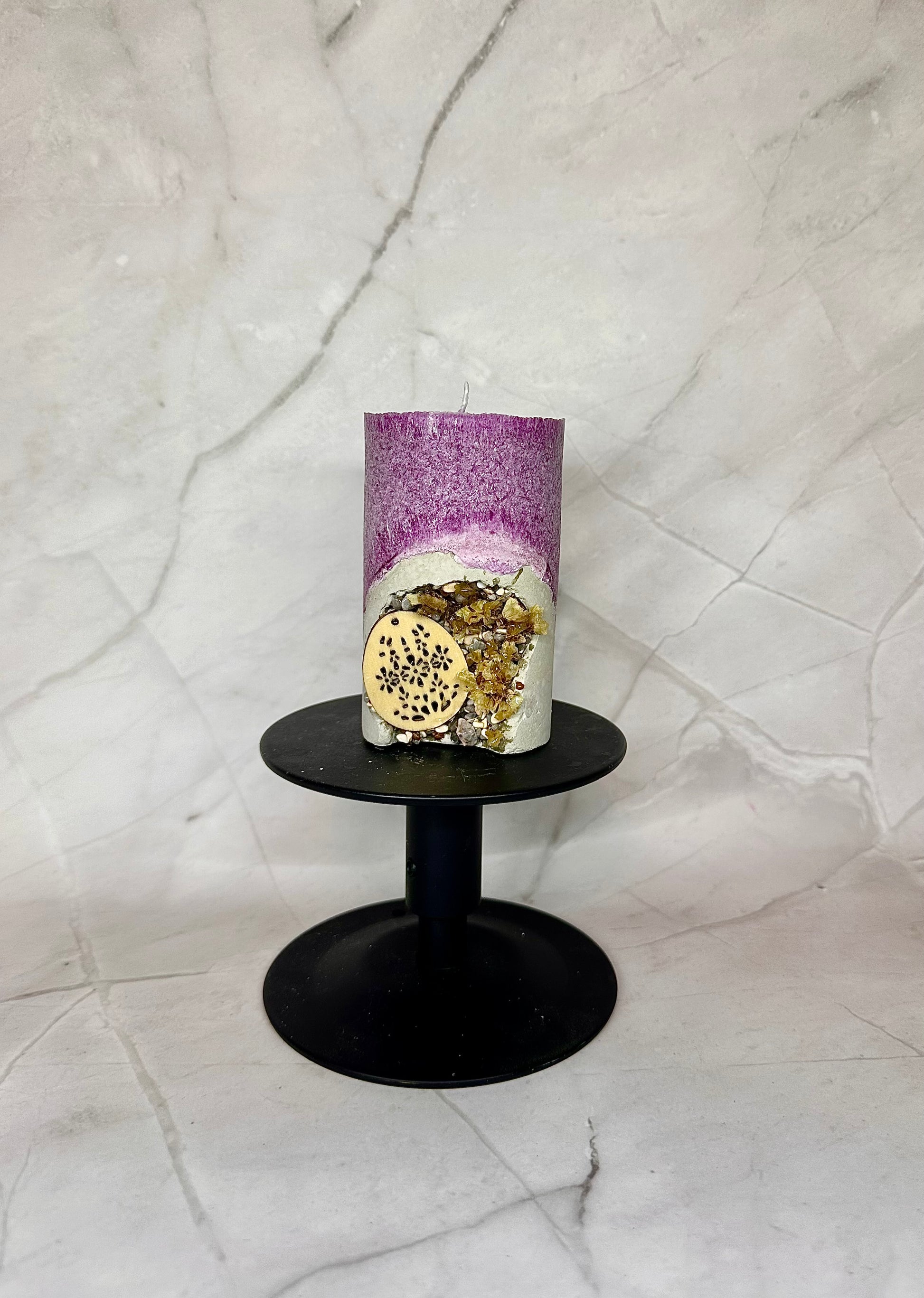 Une bougie en cire d´olive avec une base en béton, décorée de pierres et de fleurs séchées, ainsi que d’un œuf en bois.