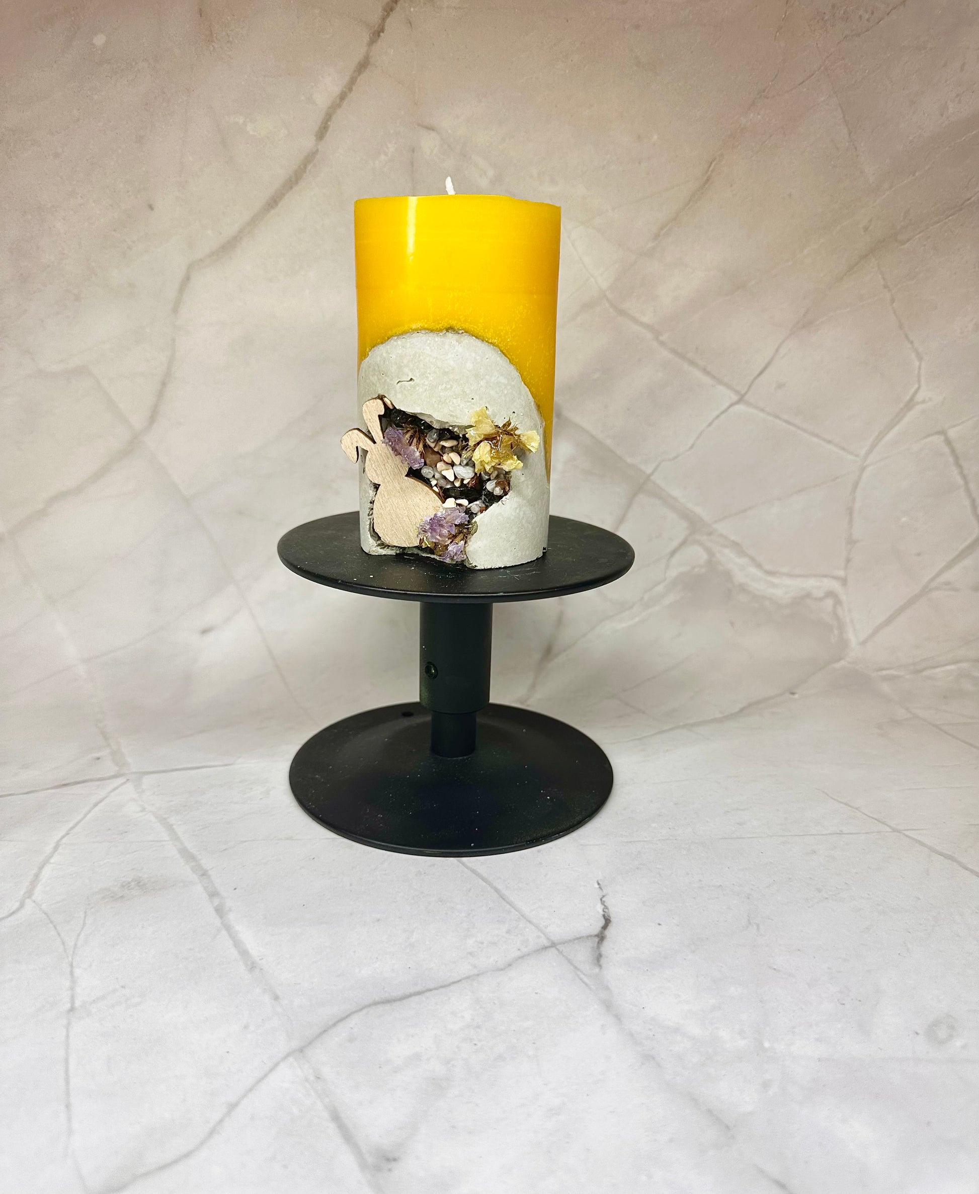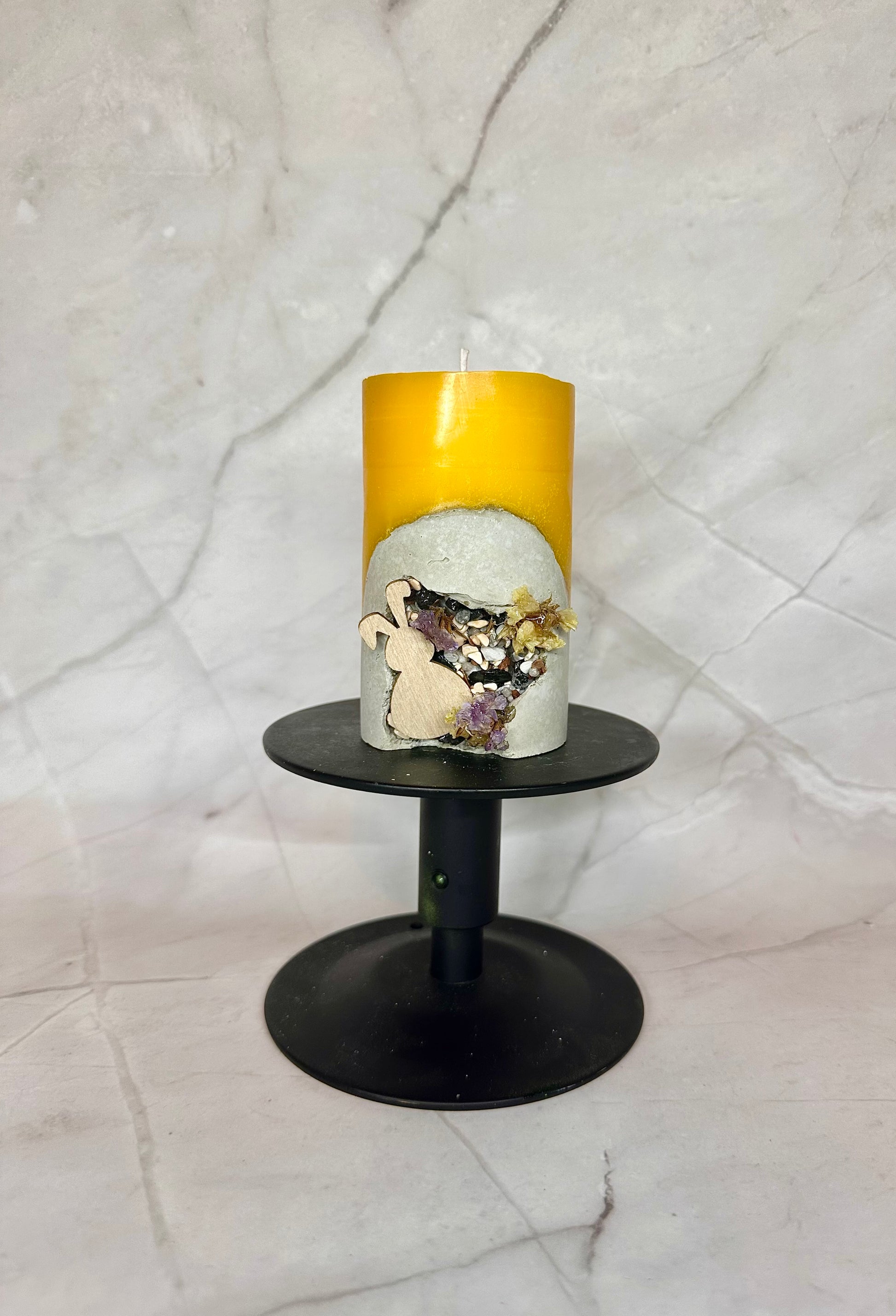 Une bougie en paraffine/stéarine avec une base en béton, décorée de pierres artificielles et de fleurs séchées, ainsi que d’un lapin en bois.